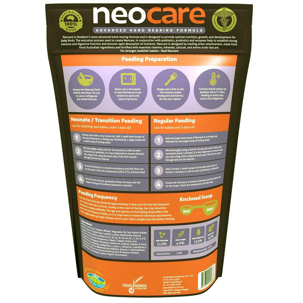 Neocare is the culmination of 40 years veterinary and nutritionist experience, resulting in unmatched baby bird growth and development. The formula contains fresh non GMO ingredients, balanced vitamin mineral and amino acid profiles along with probiotics and enzymes to kick start the infant digestive and immune systems. With excellent mixing properties, rapidly digestible nutrition and veterinary backing, there is simply no better way to start the life of baby bird than with Neocare.