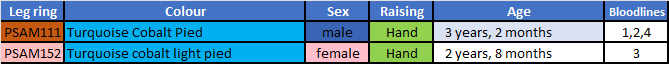 Proven pair 4 were hand raised and therefore are very easy to deal with (e.g. during nest checks/cleans) They produce the most amazing colours, including both single and double dark factor mutations.