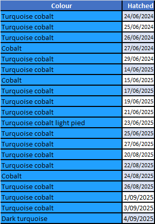 Genetic prediction: 50% turquoise cobalt, 25% cobalt, 25% dark turquioise. All young are split to American.
